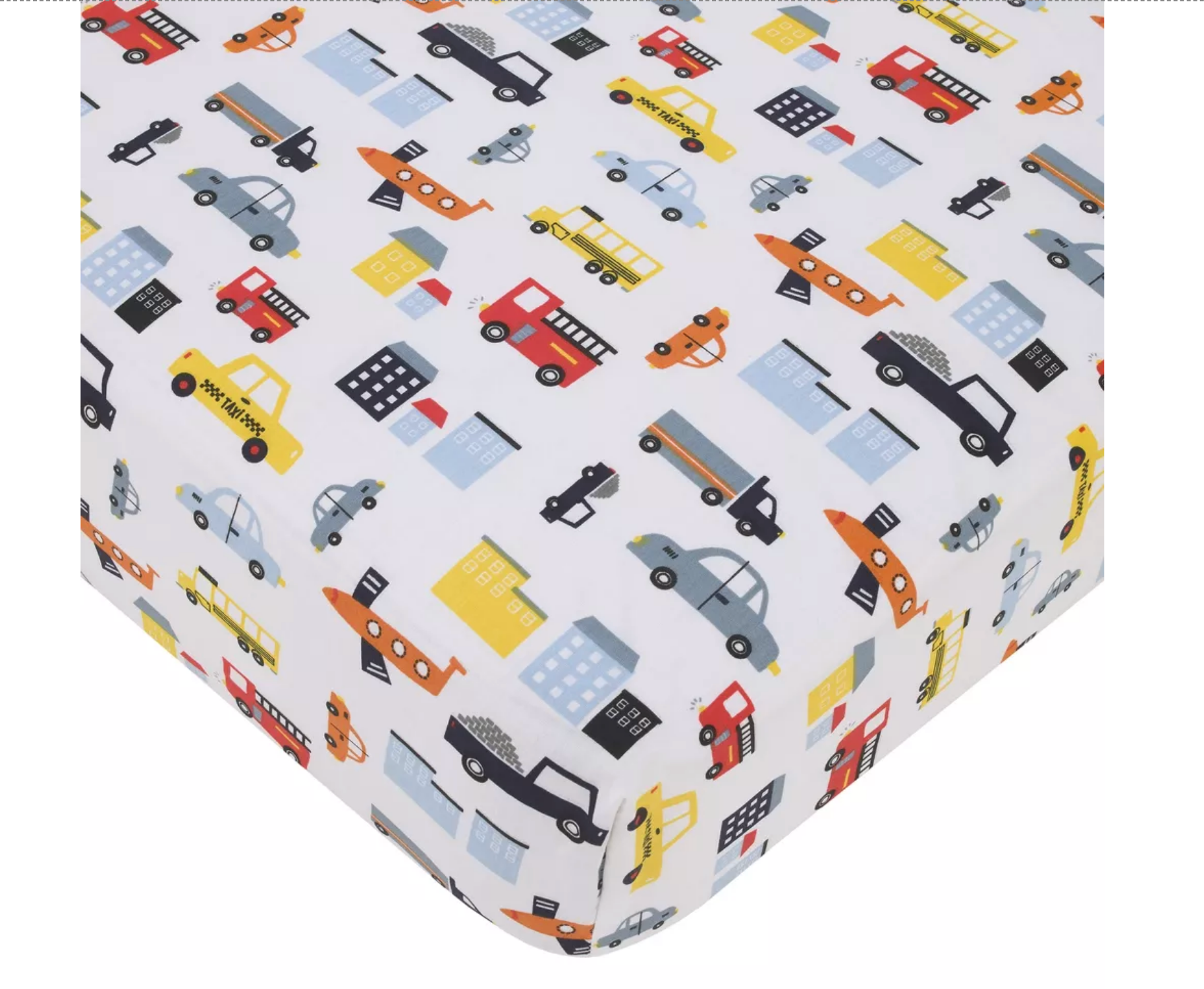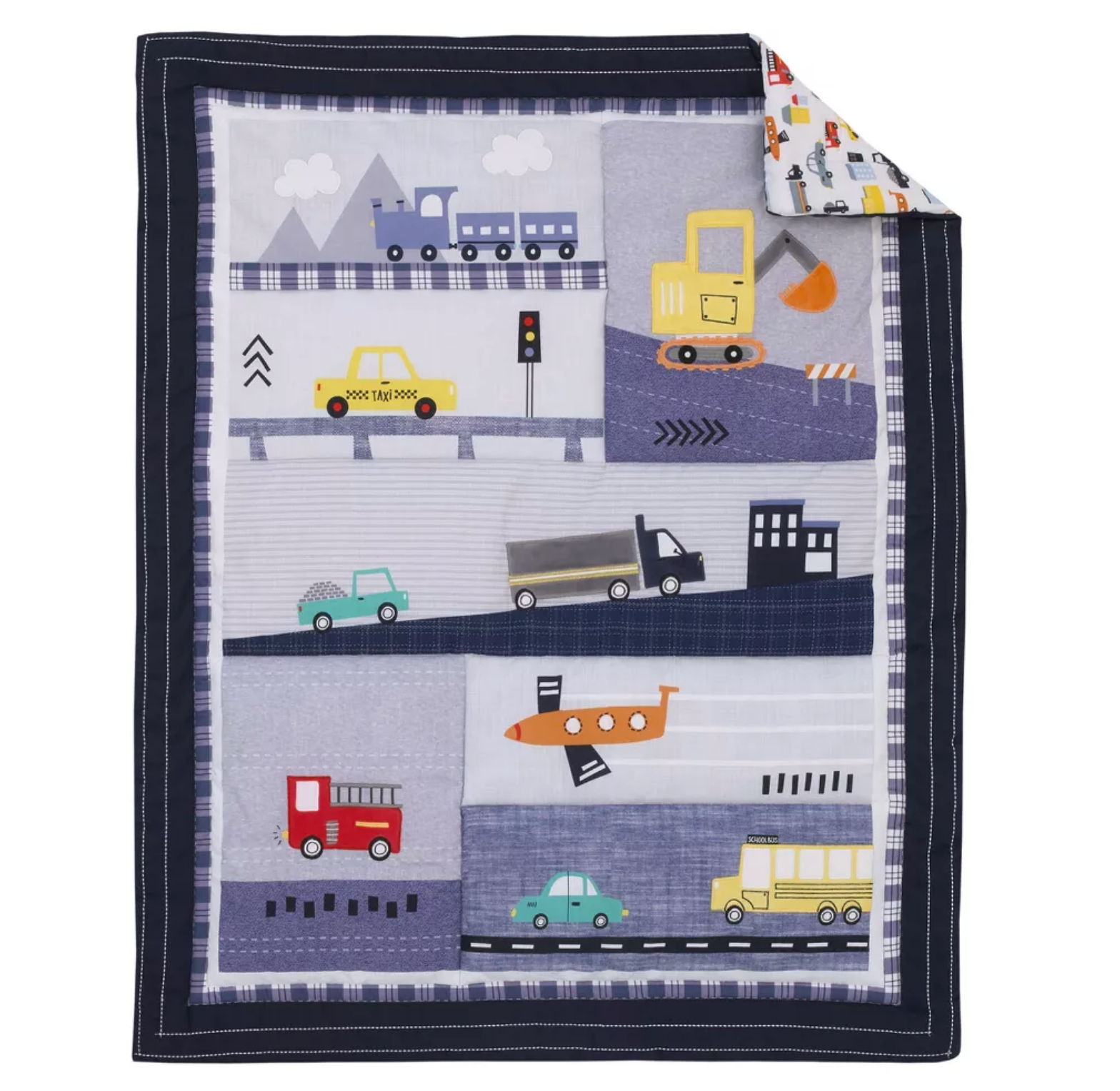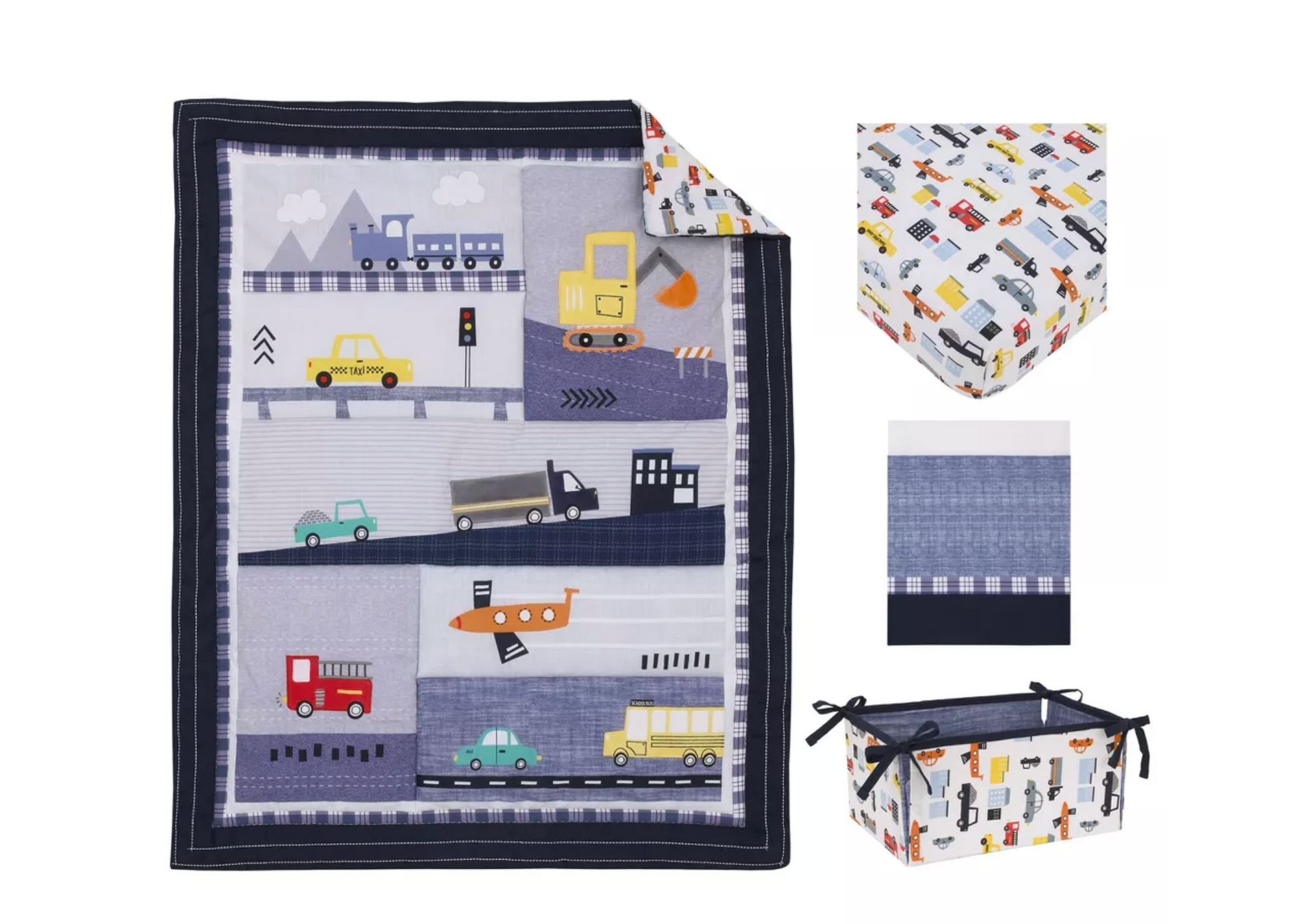The NoJo Transportation Trails 4 Piece Crib Bedding Set includes a comforter, fitted crib sheet, crib skirt, and nursery organizer