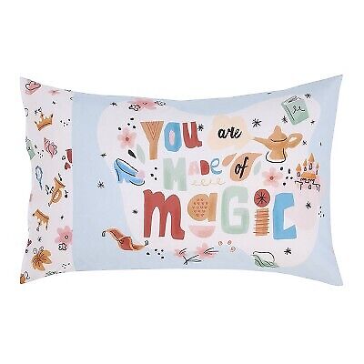 Disney Princesses Just Be You 4 Piece Toddler Bed Set includes a comforter, fitted bottom sheet, flat top sheet, and reversible pillowcase. Measuring 42" x 57", this lovely comforter features all the princesses with encouraging sayings in shades of soft pink, blue, yellow, and white. Perfect for your little princess's room! Machine washable for easy care!