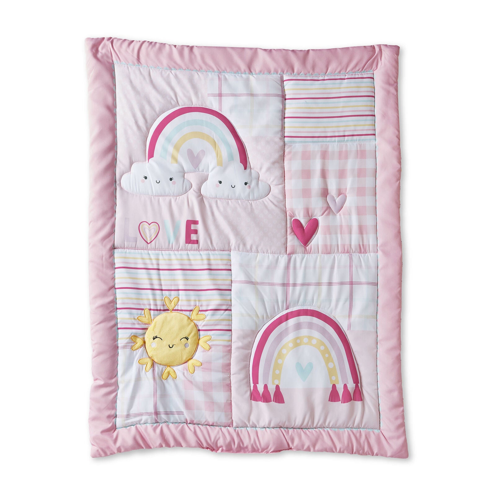 Decorate your little girl's room in a rainbow and sun themed design with the Parent's Choice My Little Sunshine Rainbow 3-Piece Crib Bedding Set! This bright and cheerful bedding collection includes an appliqued comforter, fitted crib sheet, and soft baby blanket, all in rainbow shades of pink, aqua, purple, yellow and white. The printed comforter measures 33 inches by 42 inches and has a patchwork design of rainbows, clouds and hearts on a background of stripes, plaids and ginghams; features a happy sun appliqued in soft velboa fabrics. The fitted crib sheet, in a multi-colored plaid and rainbow print, has elasticized edges for a snug fit and fits a standard size 28-inch by 52-inch crib mattress. The soft and cozy baby blanket measures 30 inches by 30 inches and has an allover pink and white rainbow and heart print. All made of super soft fabrics and are machine washable for easy care. They are Oeko-Tex certified. Give your child a cute and comfy place to sleep with the Parent's Choice My Little Sunshine Rainbow 3-Piece Crib Bedding Set.