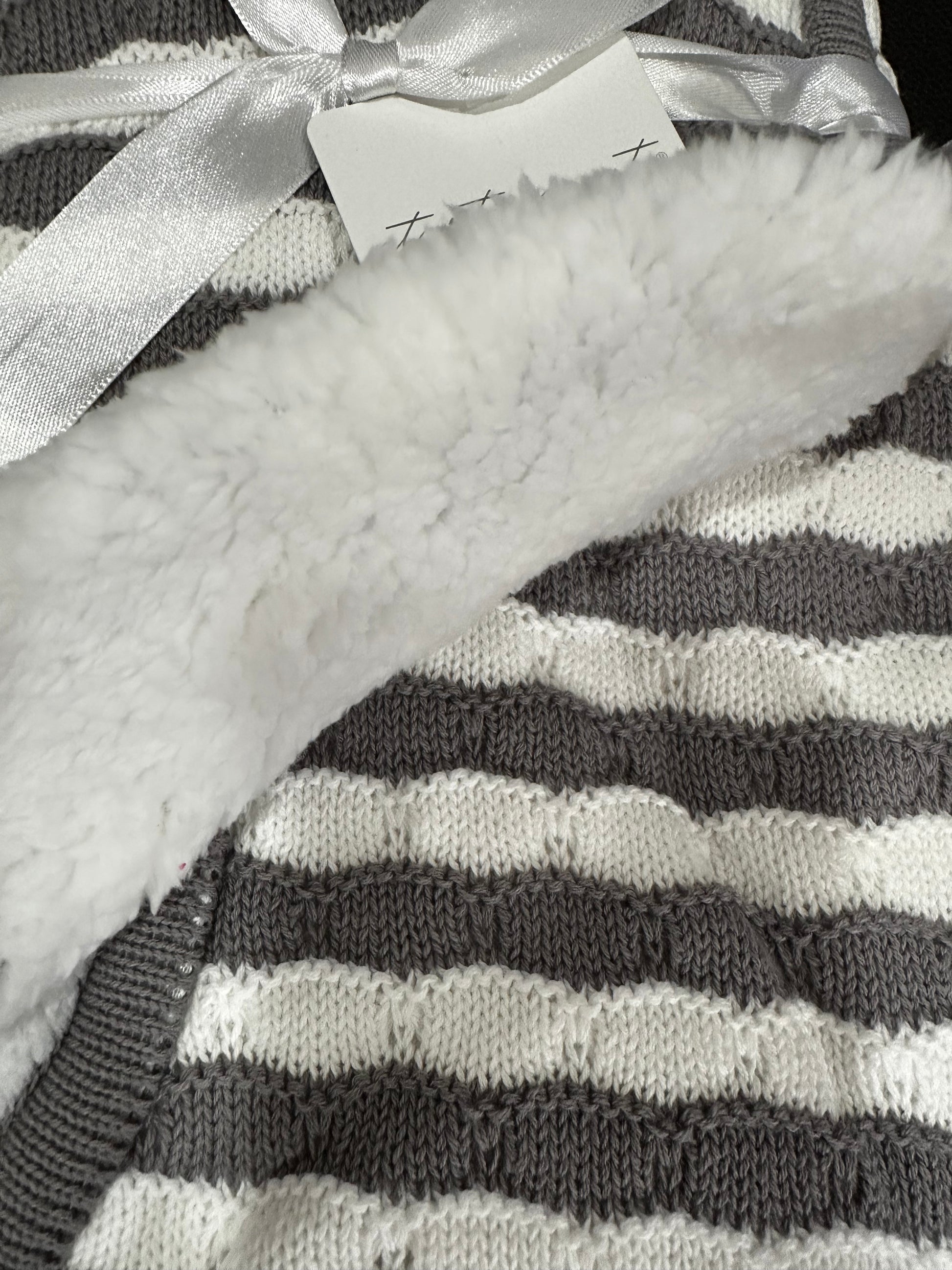 Your little one will love our incredibly soft plush blanket with grey and white stripe chenille. Measures 30 in. x 40 in. Made with Polyester Cotton Blend
