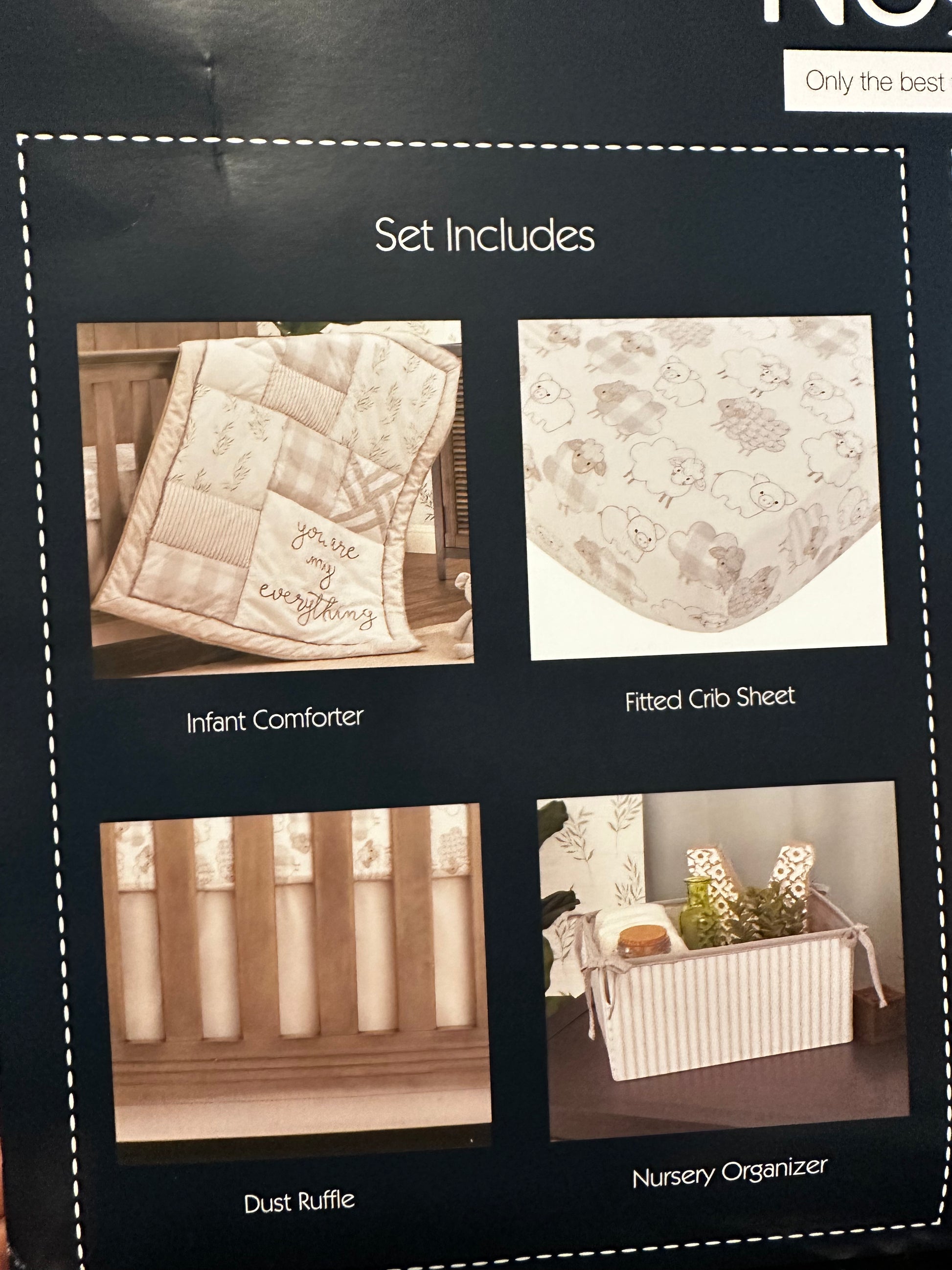 4 pieces set features: comforter, crib sheet, dust ruffle and nursery organizer